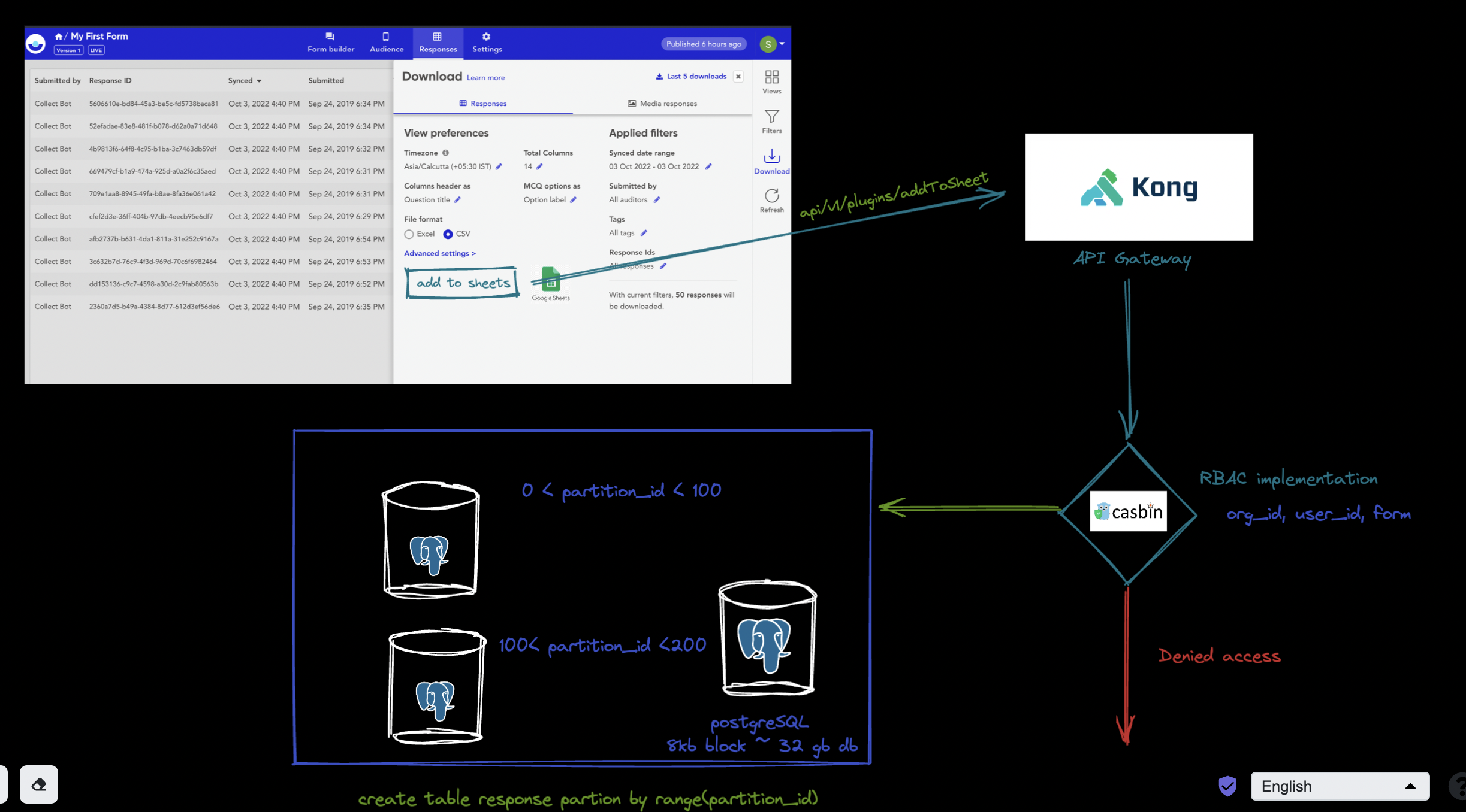 After getting the permissions, we can add a button at download modal which would communicate to our api gateway kong. The choice of kong was made due to it’s flexibility and customisability which would be really helpful in integrating new plugins/integration later. For example, to add feature of google sheet plugin, we can define an API endpoint /plugin/sheet and kong will easily redirect it to our plugin microservice. With kong, we can also integrate casbin for our RBAC (Role based access control) feature.