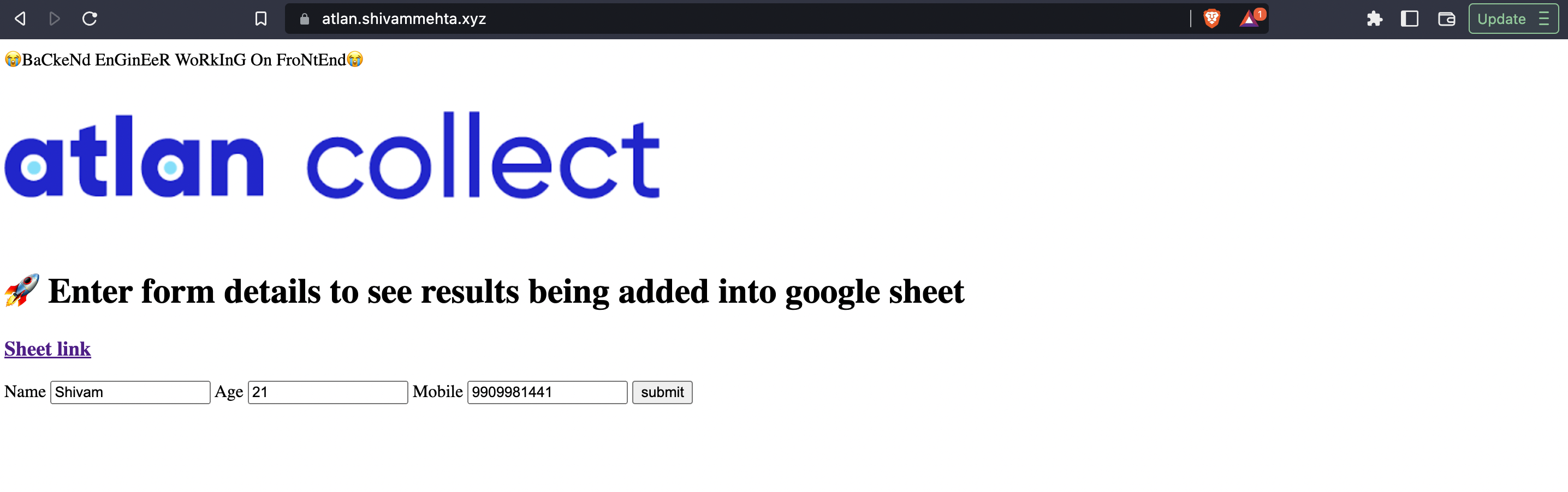 ⚠️ The application is hosted in heroku which makes request to AWS SQS which in turn makes request to AWS lambda which inserts the data into google sheet. Code can be found in sheet serivce. You may face cold start from heroku.