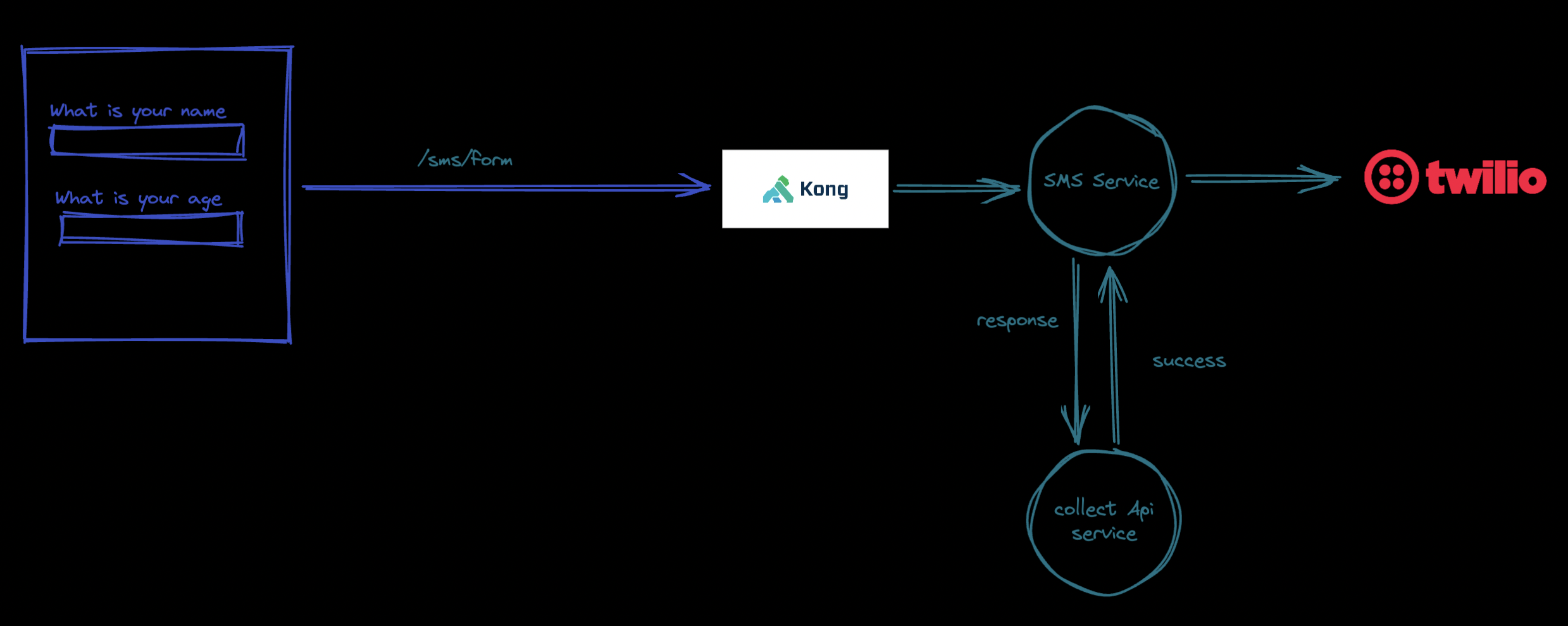 Now let’s say the client demands to send sms after a response is being received. We follow the same procedure, create a service, add it to kong, route the response submission to sms service. The sms service then validates the response send the submission to api backend service and if the response is stored, we send sms to the user.